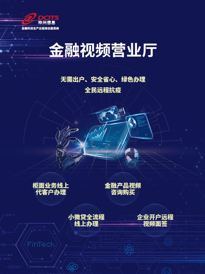 新型冠状肺炎病毒正在威胁着人民大众的健康,这个时候最安全的防护莫过于“宅”家。可是不出门,想办理金融业务怎么办?针对当前疫情带来的种种不便,神州信息视频营业厅金融解决方案,帮助银行将营业网点搬到线上,通过视频方式,将银行员工带进家中,“面对面”地提供金融服务,既消除了网点与客户的物理距离,又能解决一些客群在自助机具或是机器人线上应答服务时遇到的不方便的操作问题。