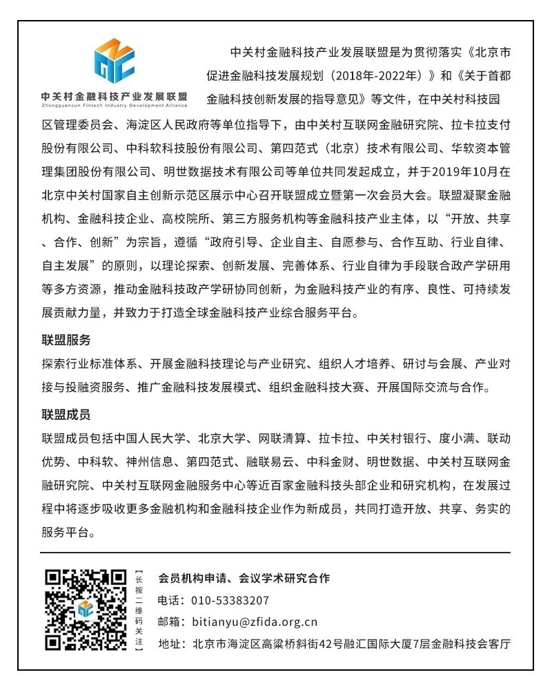 除以上工作之外,联盟还将积极配合政府部门开展相关研究工作,并建立全方位的金融科技国际交流渠道,促进金融科技与资本的国际化融合;吸引全球知名金融科技企业和服务平台在中关村设立各类分支机构和创新平台,促进外资金融机构、金融科技企业与联盟会员开展业务交流;引导中关村金融科技企业开展国际化业务探索,服务于跨境金融领域的科技创新需求,在海外积极拓展市场;全面丰富金融科技国际合作模式,积极引进金融科技国际化人才,建立与国际金融中心城市在金融科技领域的交流磋商机制,深化与新加坡、香港、台湾地区的合作交流,与国际知名金融科技的会展机构就论坛、展会展开合作。