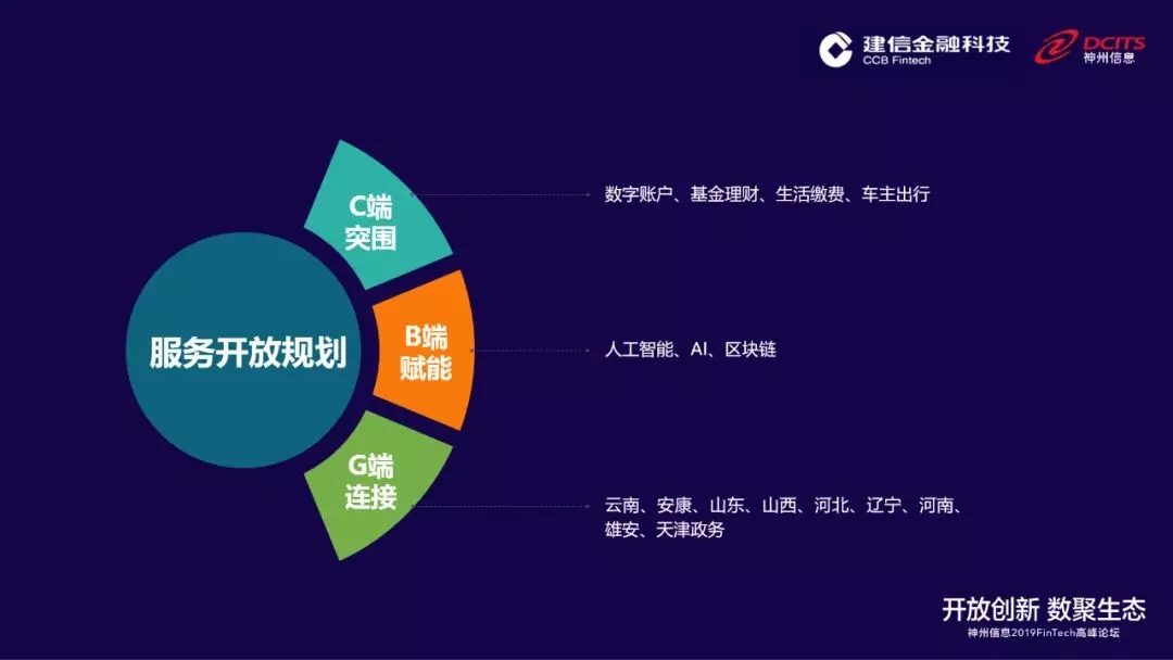 建行未来的开放银行建设主要规划为“C端突围、B端赋能、G端连接”。